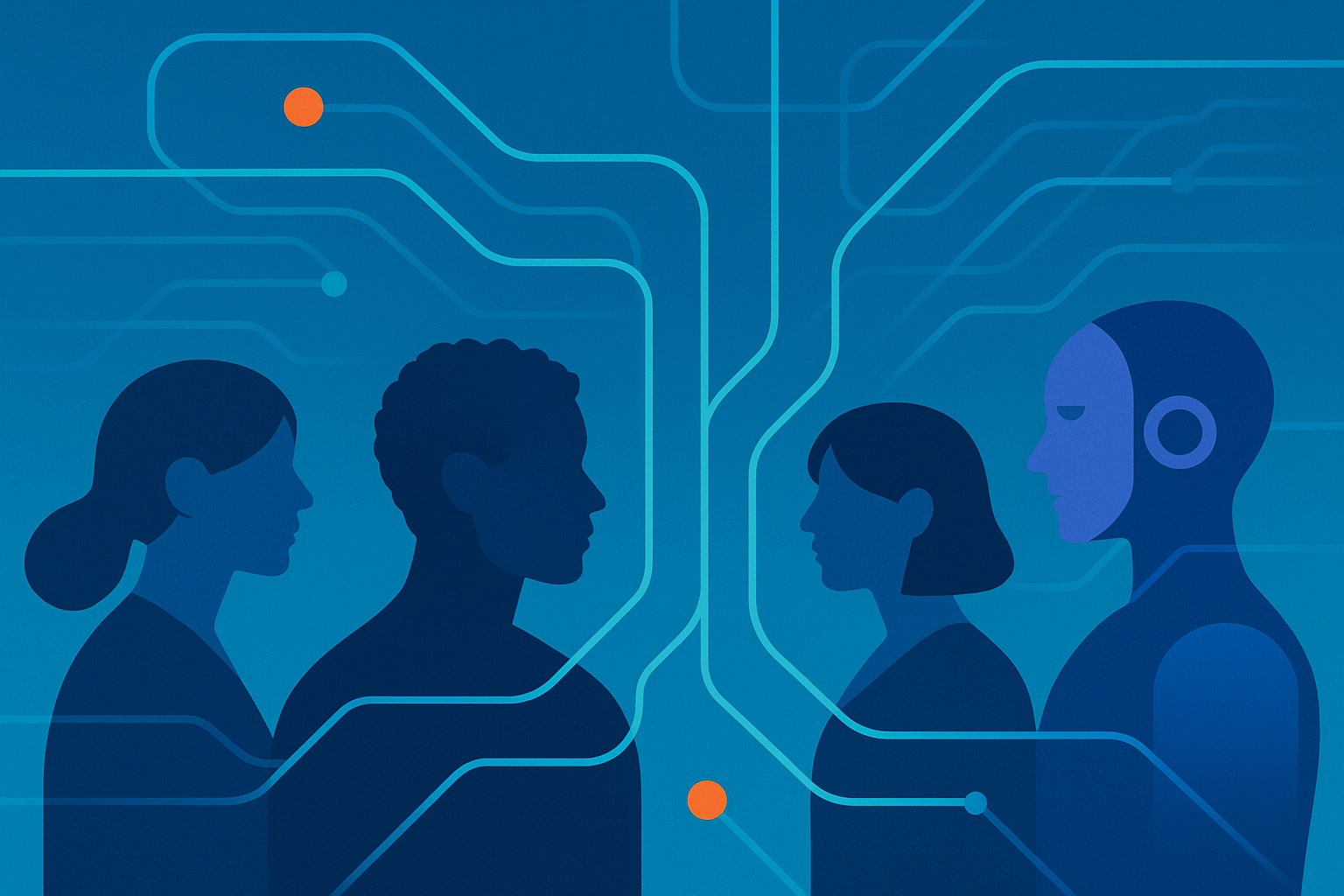 4:3, KI-Karriere-Kompass-Schema: „clean semi-tech aesthetic, career pathways, human-machine collaboration“, ohne Text; Alt-Text: „Abstrakte Pfade, die Lern- und Karrierewege mit KI symbolisieren.“